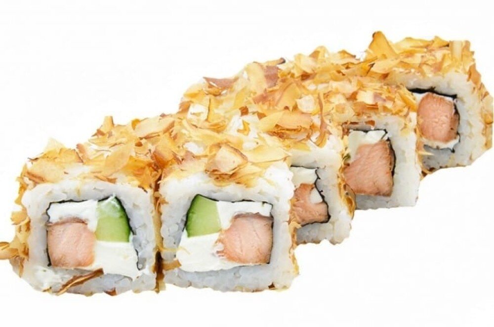 Сливочный сыр, лосось жаренный в соусе «Терияки», огурец, стружка тунца