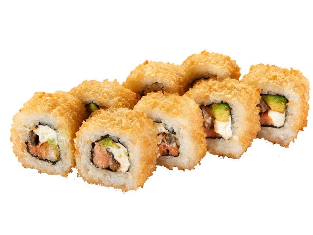 Сливочный сыр, угорь, лосось, огурец, кляр «Темпура», сухари «Панко»