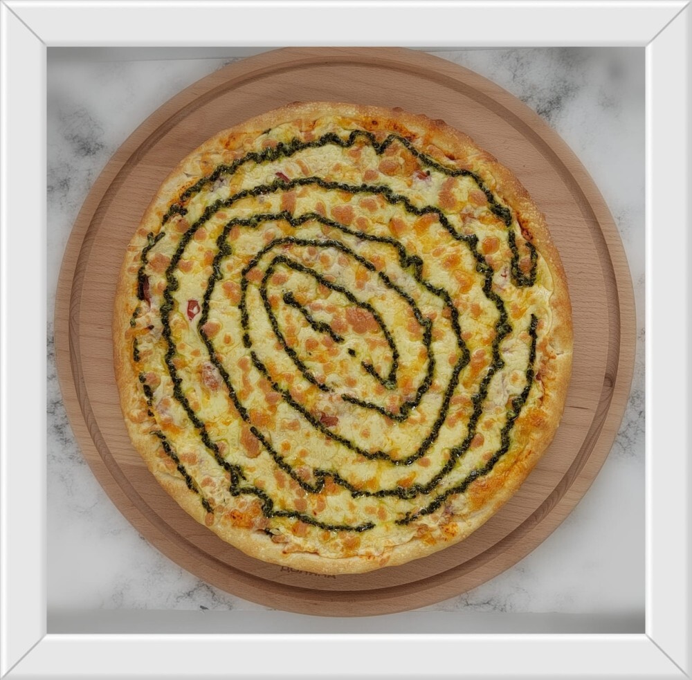 Соус «базиликовый», помидоры, чеснок, сыры «Российский», «Моцарелла»