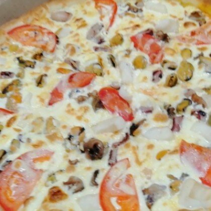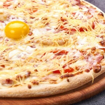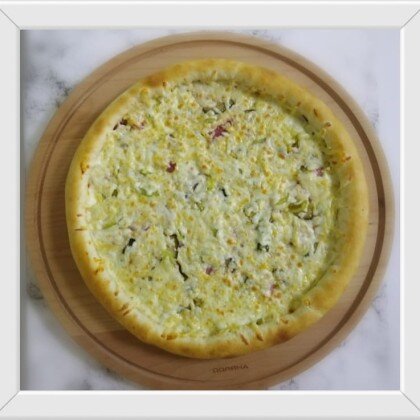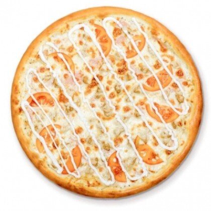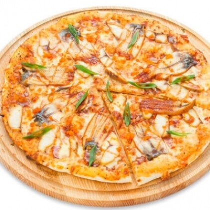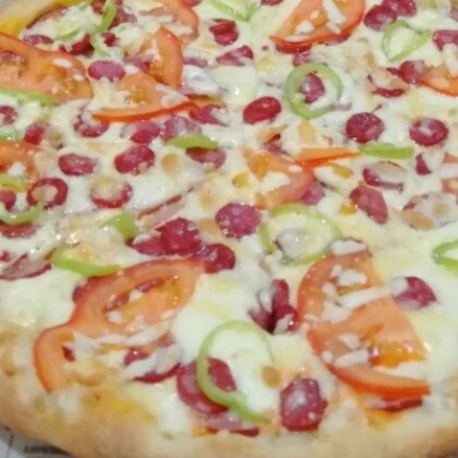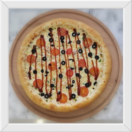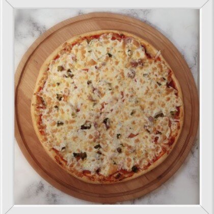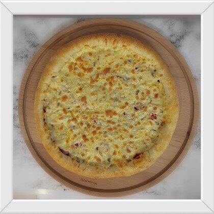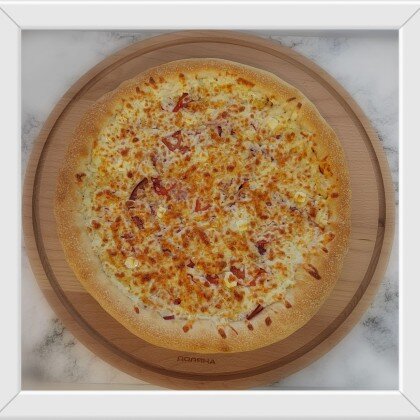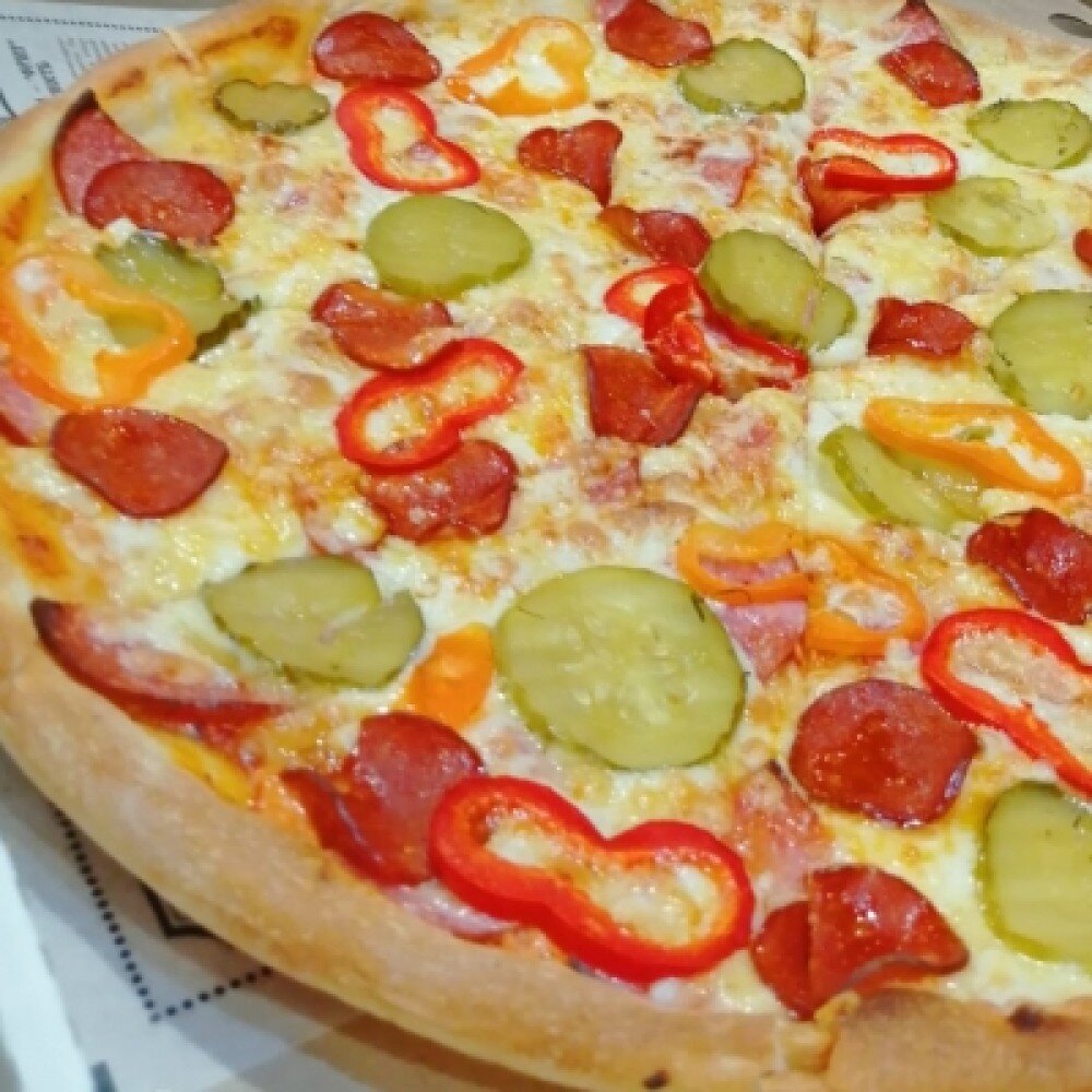 Острая пицца с колбасками пепперони, соленый огурчик, соус "Мутти", сыры "Российский", "Моцарелла"
