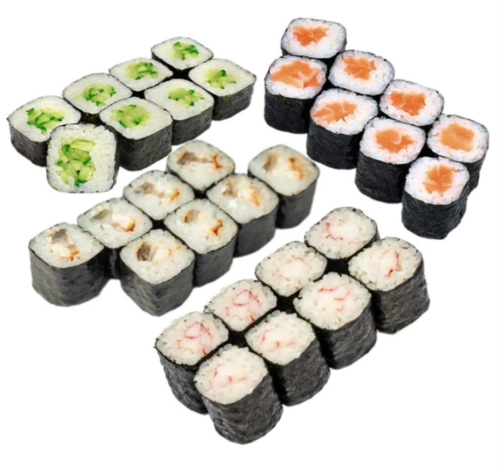 "Классический ролл с огурцом", "Классический ролл с лососем", "Классический ролл с угрем", "Классический ролл с крабом". (32шт.)