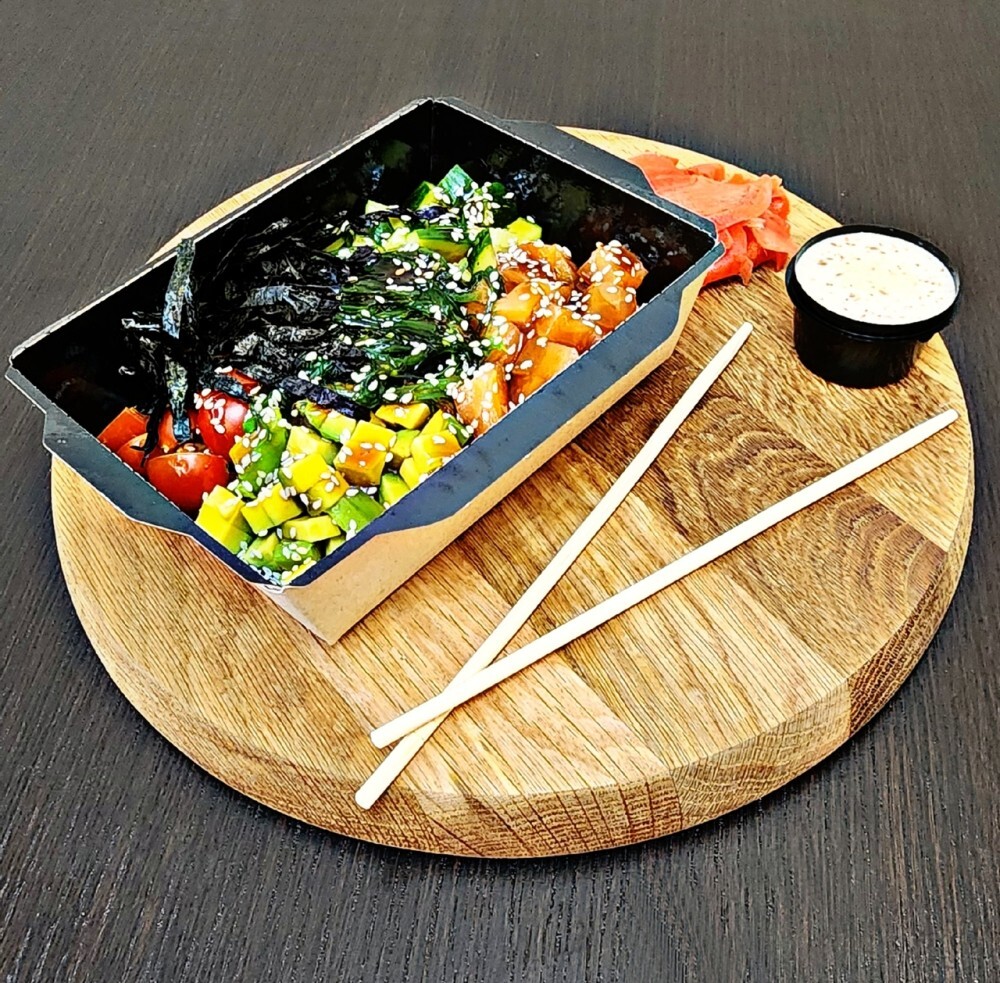 Рис, морские водоросли, помидоры черри, авокадо, огурец (свежий), лосось (слабосоленый), чукка, кунжут. Заправлен соусом унаги и соевым соусом. Подаётся с ореховым соусом и имбирём.