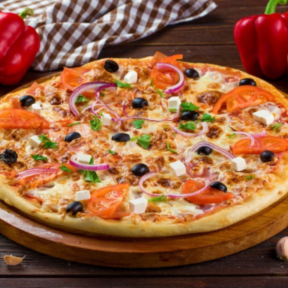 Соус "Мутти", ветчина, красный лук, сыр "Фета", маслины, сладкий перец, сыры "Российский", "Моцарелла", свежие помидоры