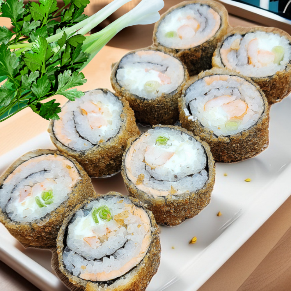 Рис, нори, креветка, лосось, сыр сливочный, зеленый лук, кляр «Темпура», сухари «Панко»