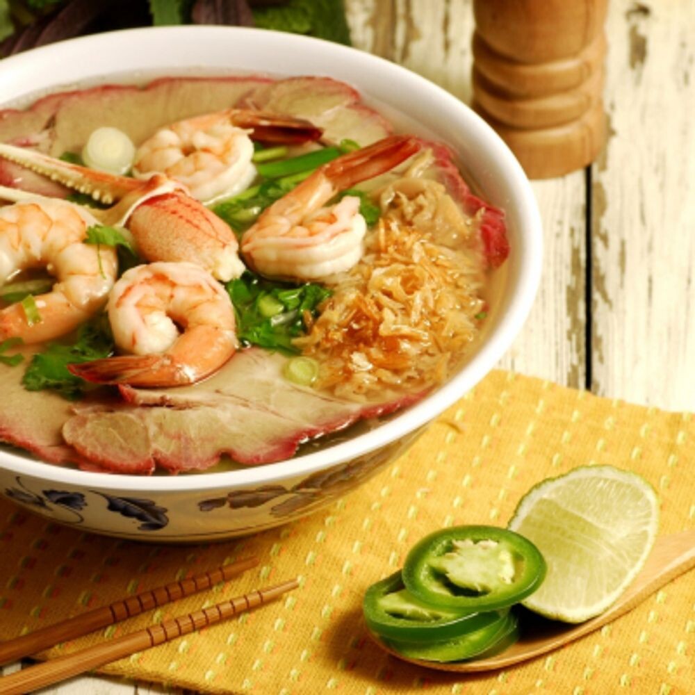 Тигровая креветка, лосось, угорь, картофель, морковь, лук репчатый, бульон