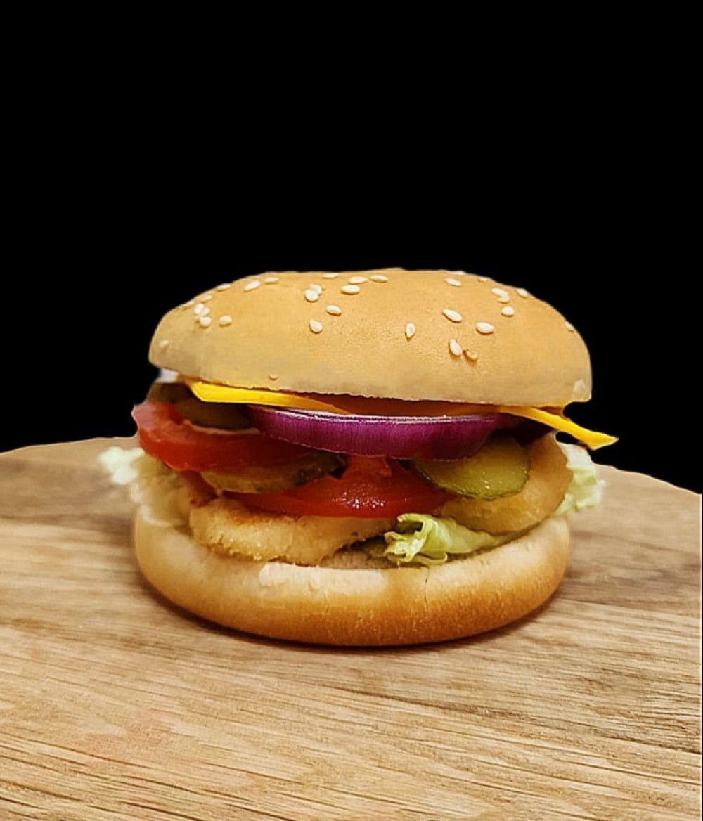 Белая булочка с кунжутом (125мм), куриная котлета в панировке, соус шрирача, лук, сыр чеддер, маринованные огурцы, помидоры